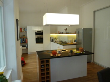 Ein außergewöhnliches Detail bei diesen Arbeitsplatten in Nero Assoluto fällt erst bei genauerer Betrachtung der Inselplatte ins Auge: Hier wurden anstelle eines zentralen Kochfelds insgesamt 6 Stück flächenbündige Einzelkochplatten über die gesamte Breite der Kochinsel verteilt angeordnet.