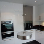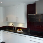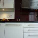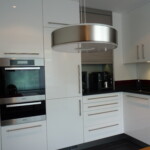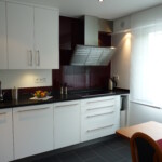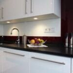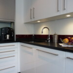 Die Arbeitsplatten sind mit einem CNC-gefrästen Ausschnitt für ein Unterbaubecken, wasserstrahlgeschnittenen Bohrungen für Armatur und Excenter sowie einem wasserstrahlgeschnittenen Ausschnitt für ein Induktionskochfeld ausgestattet.