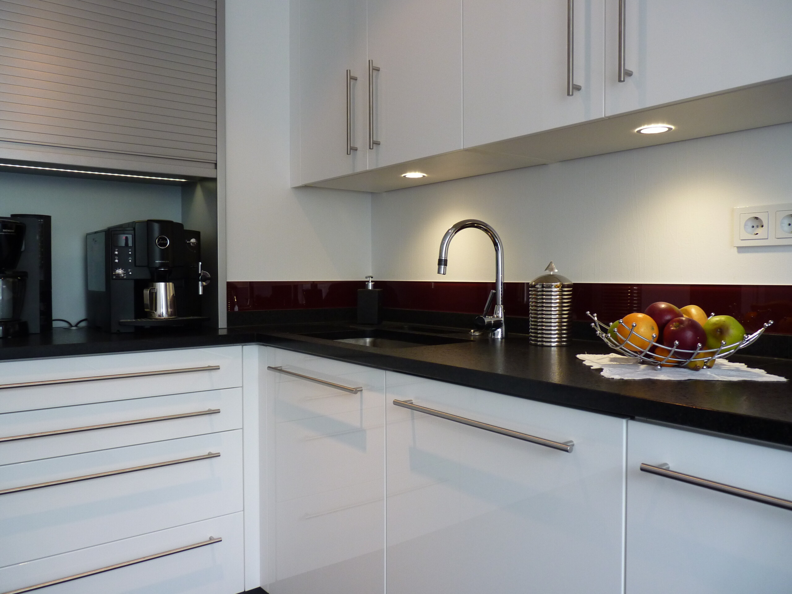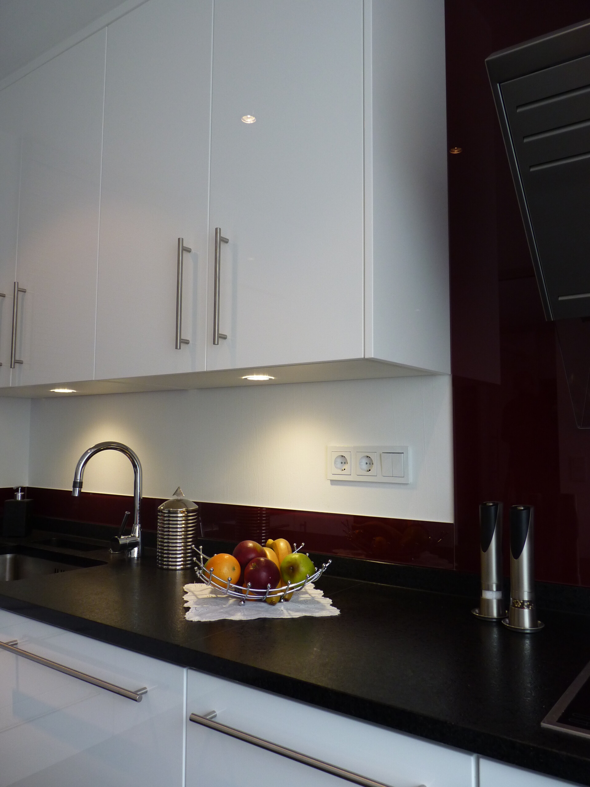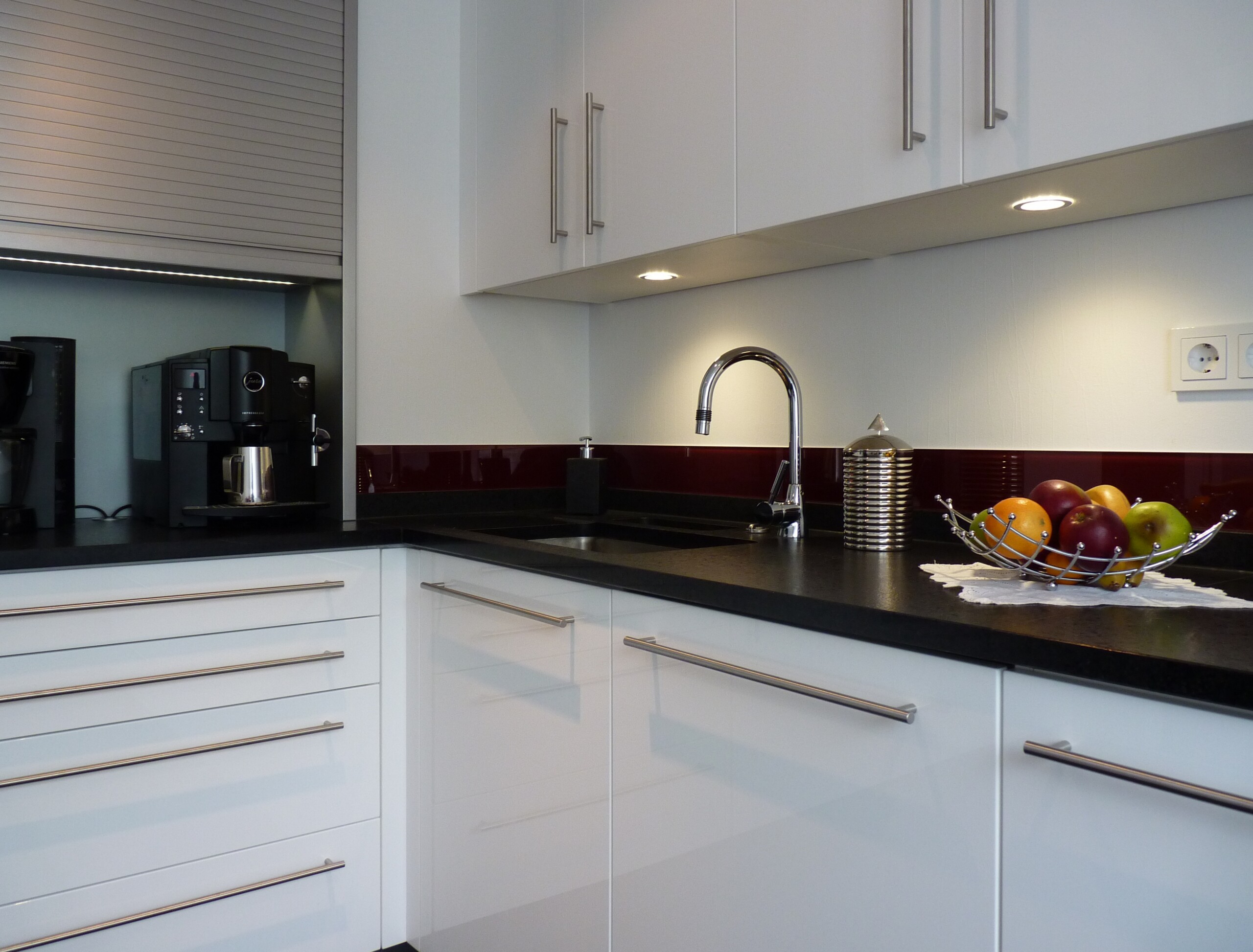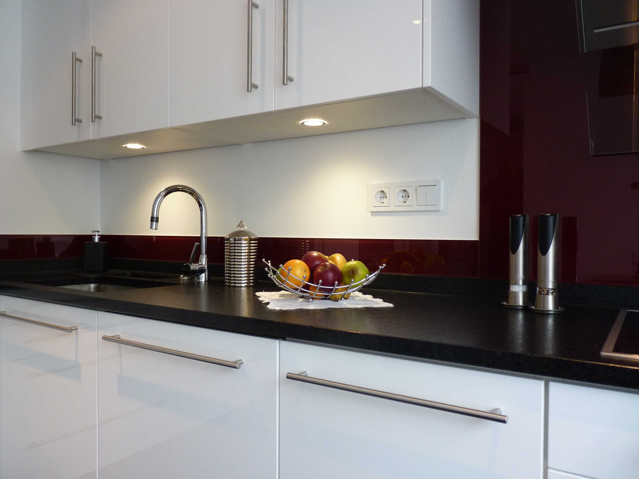 Die Arbeitsplatten sind mit einem CNC-gefrästen Ausschnitt für ein Unterbaubecken, wasserstrahlgeschnittenen Bohrungen für Armatur und Excenter sowie einem wasserstrahlgeschnittenen Ausschnitt für ein Induktionskochfeld ausgestattet.