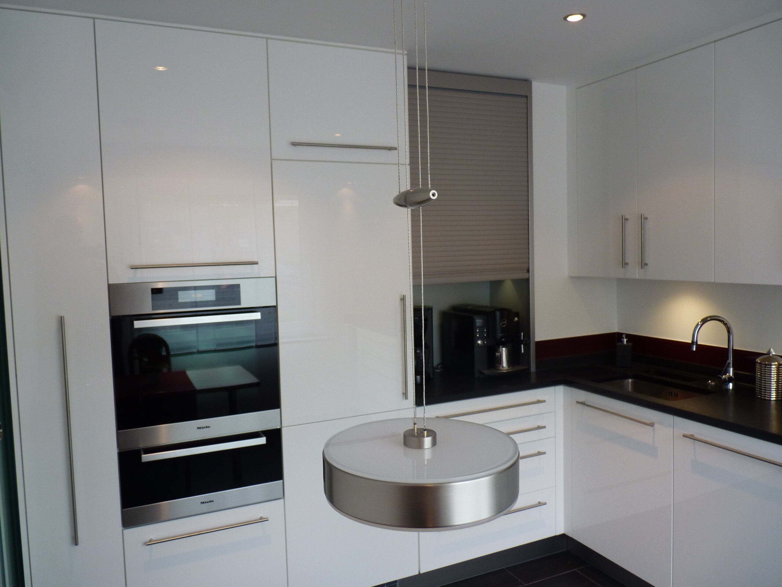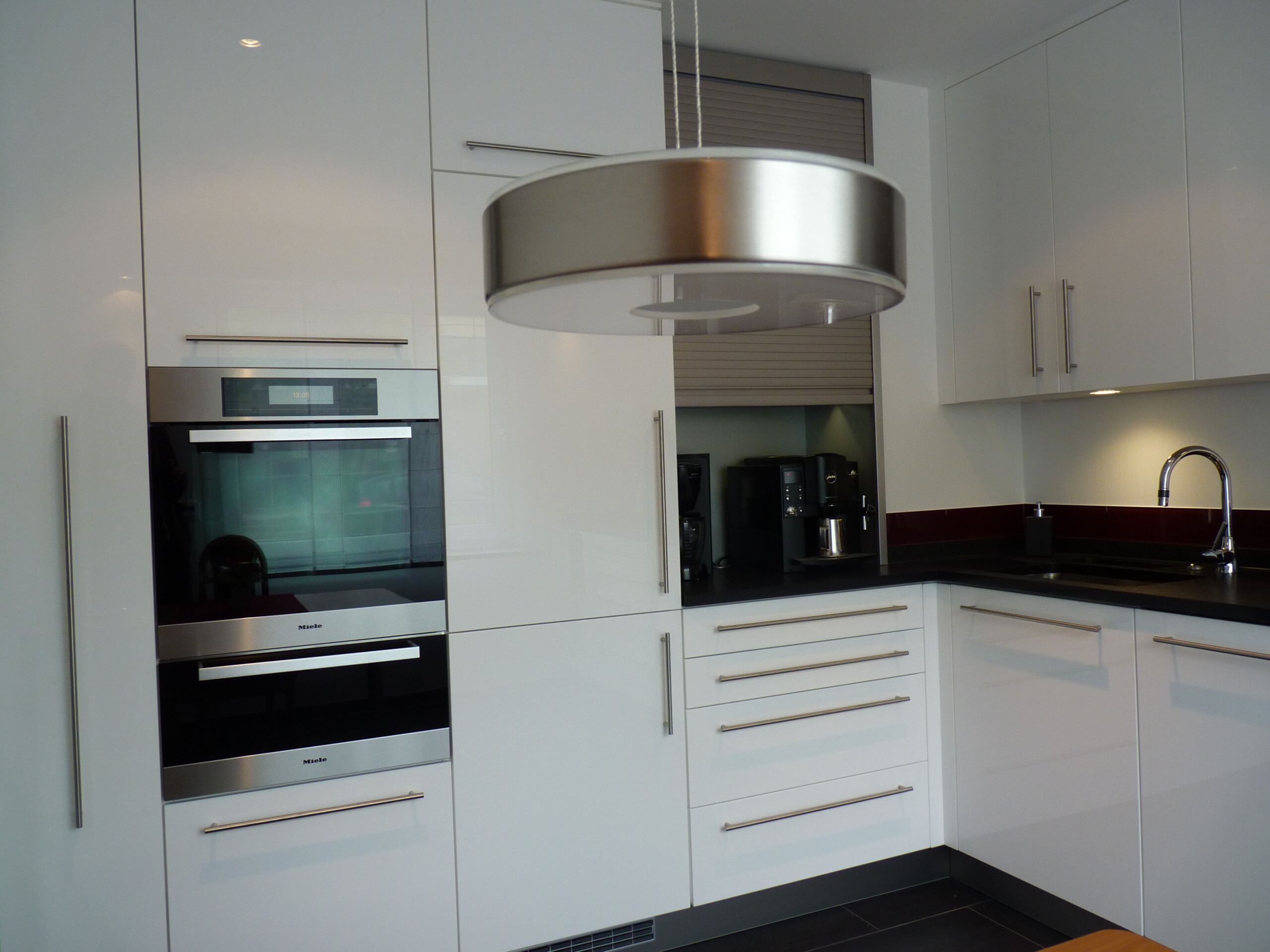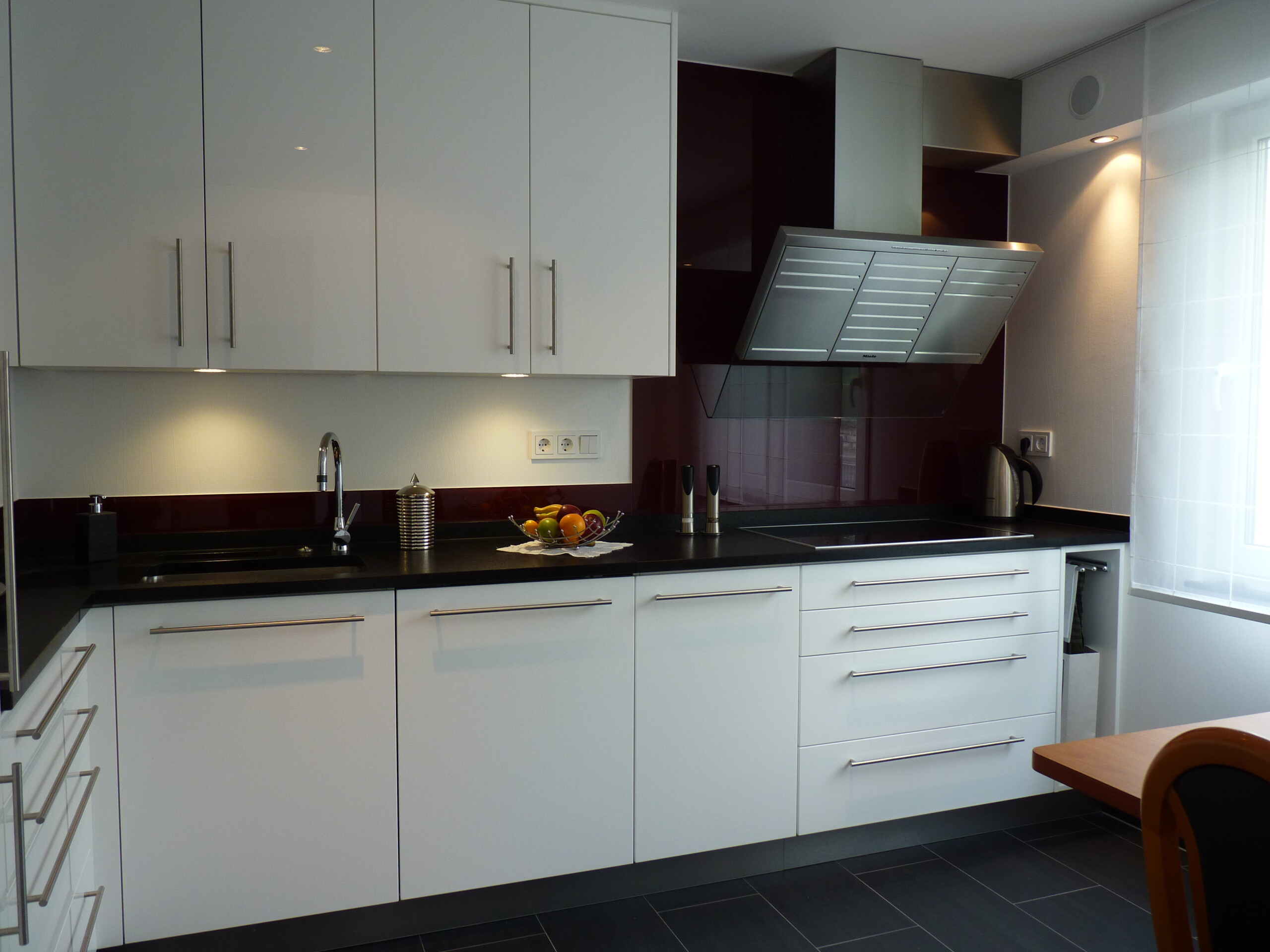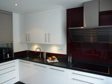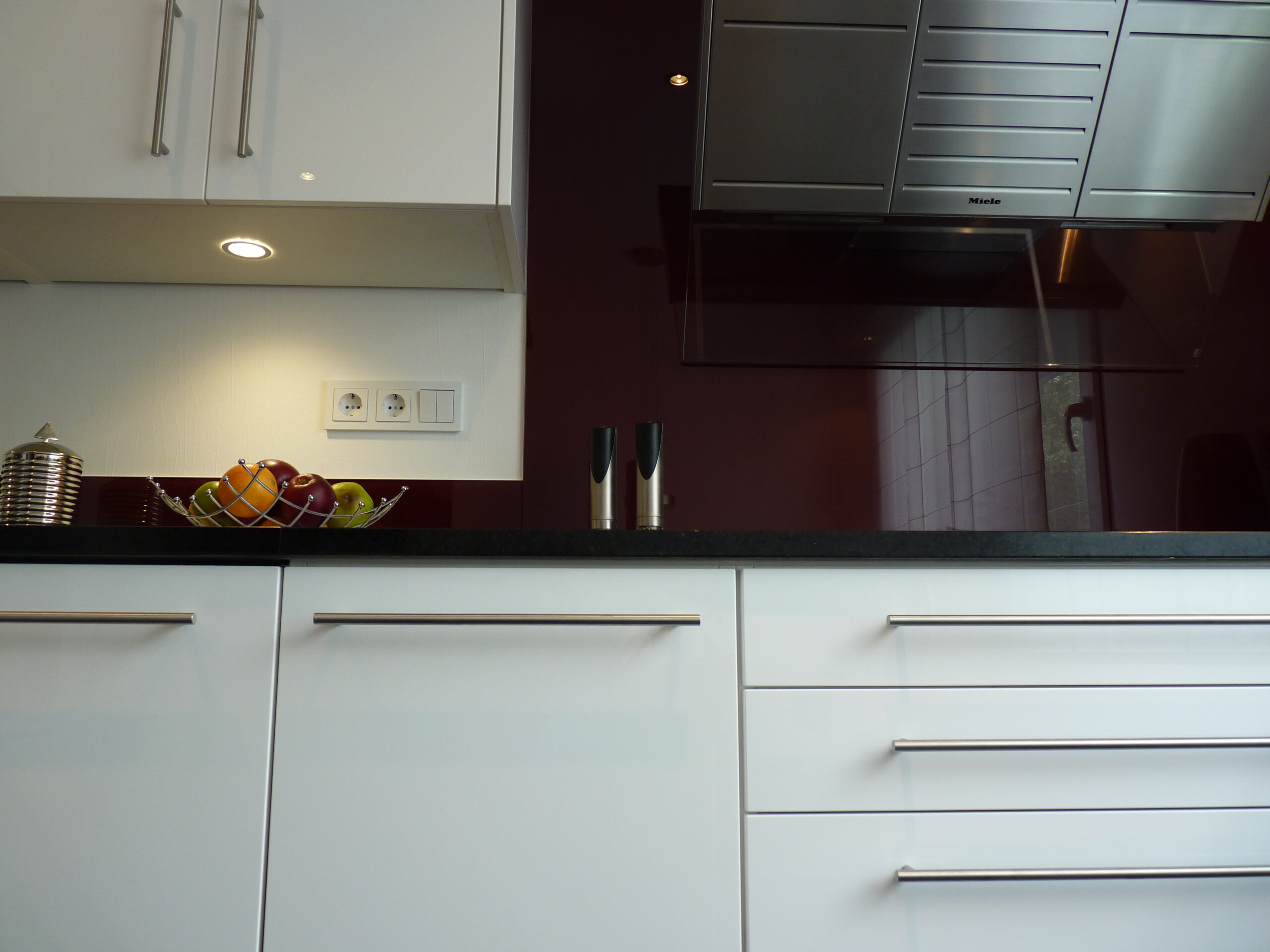 Die Arbeitsplatten sind mit einem CNC-gefrästen Ausschnitt für ein Unterbaubecken, wasserstrahlgeschnittenen Bohrungen für Armatur und Excenter sowie einem wasserstrahlgeschnittenen Ausschnitt für ein Induktionskochfeld ausgestattet.