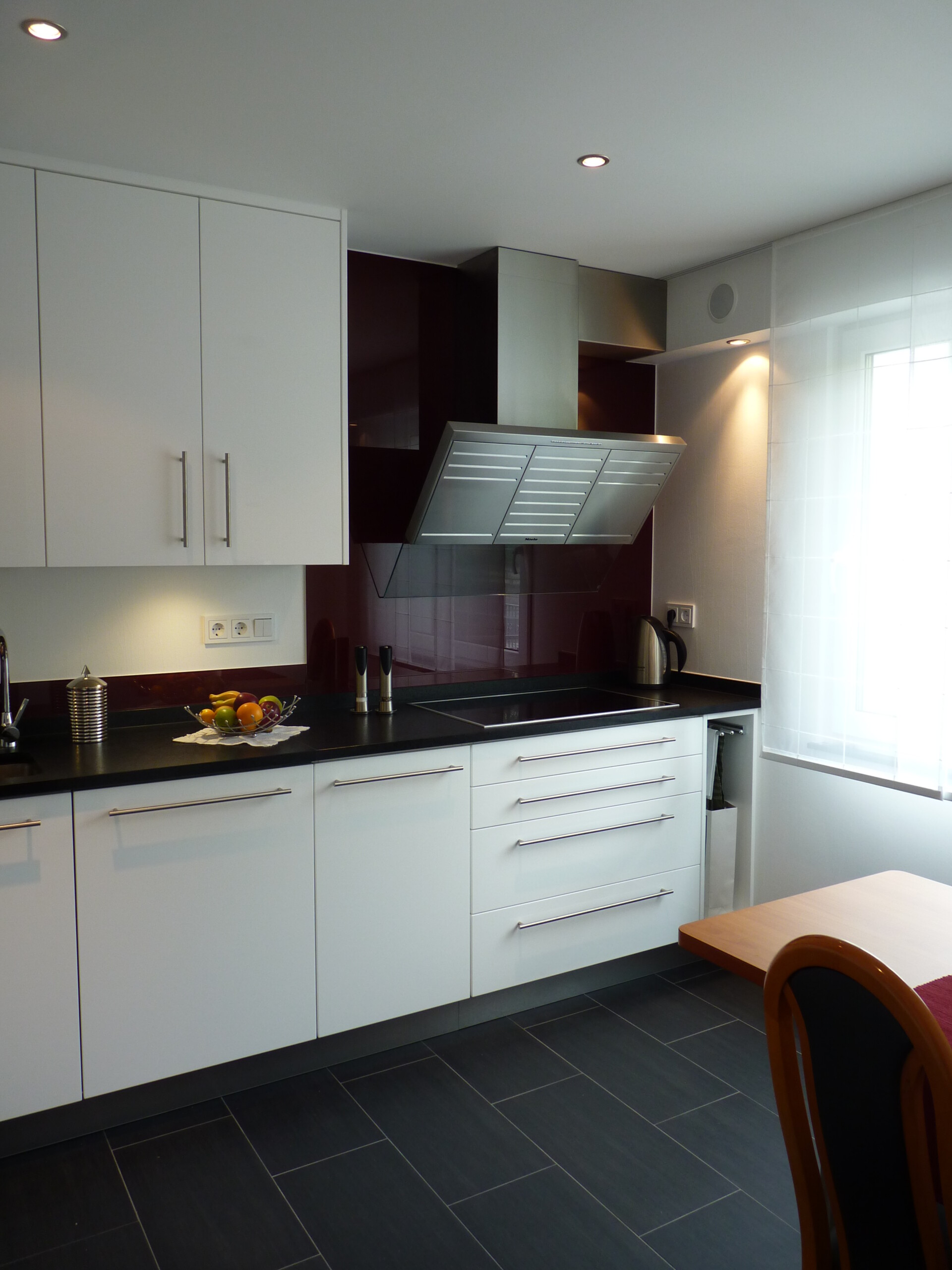 Das dunkle Hartgestein, hier mit satinierter Oberflächenbearbeitung ausgeführt, bietet einen schönen Kontrast zu den weißen Möbelfronten und nimmt den Farbton der Bodenfliesen auf.